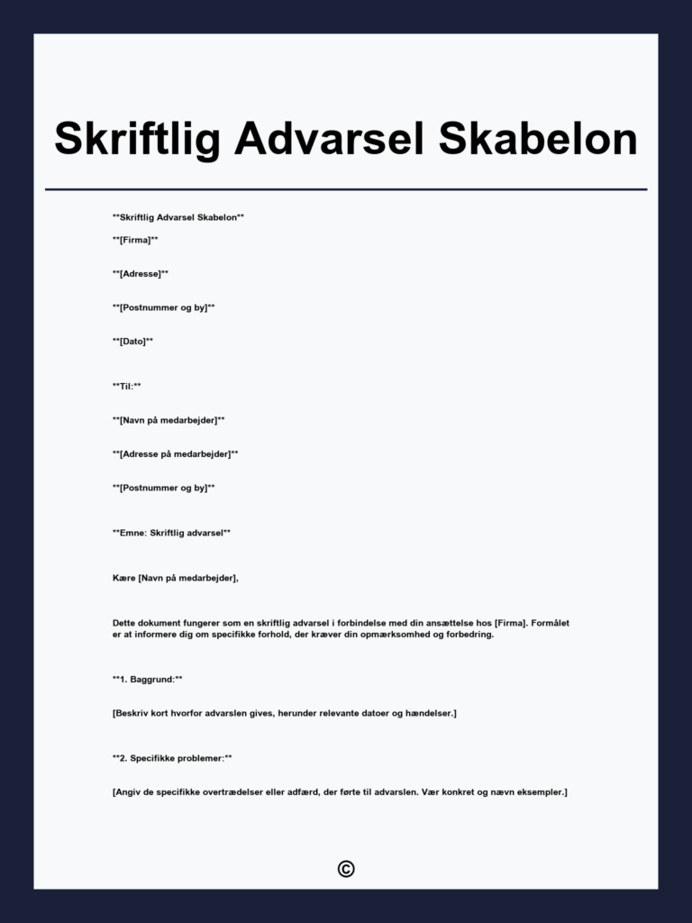 Du kan downloade vores skabelon til skriftlig advarsel, som er designet til at hjælpe arbejdsgivere med at håndtere situationer, hvor der er behov for at give en advarsel til medarbejdere. Uanset om det drejer sig om opsigelse, bortvisning, eller en advarsel vedrørende sygdom, har vi de nødvendige dokumenter klar til dig. Med denne skabelon kan du nemt skabe en skriftlig advarsel til medarbejder, der opfylder de juridiske krav og samtidig er professionelt præsenteret. Men hvad skal en skriftlig advarsel indeholde? Vores skabelon guider dig gennem de væsentlige punkter, så du kan sikre en klar og tydelig kommunikation i din virksomhed. Besøg os og download din skabelon i dag for at beskytte din virksomhed og sikre, at dine ansatte får den rette information.