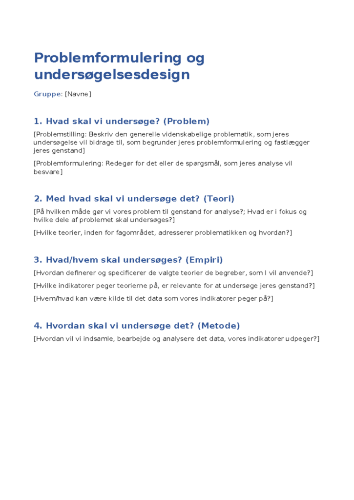 Du kan downloade vores problemformulering skabelon, en nyttig ressource for studerende og professionelle, der ønsker at skabe en klar og præcis problemformulering. Vores skabeloner inkluderer eksempler som problemformuleringer – en kort vejledning, der hjælper dig med at navigere i processen. Hvis du er usikker på, hvad en problemformulering indebærer eller søger efter et problemformulering eksempel projektopgave, er du kommet til det rette sted. Vi dækker alt fra problemstilling og problemformulering eksempel til metoder til effektivt at formulere dine spørgsmål. Uanset om du arbejder på et akademisk projekt eller en analyse, vil vores skabelon guide dig til en solid og velformuleret problemformulering, der klarlægger dit fokus og dine mål.